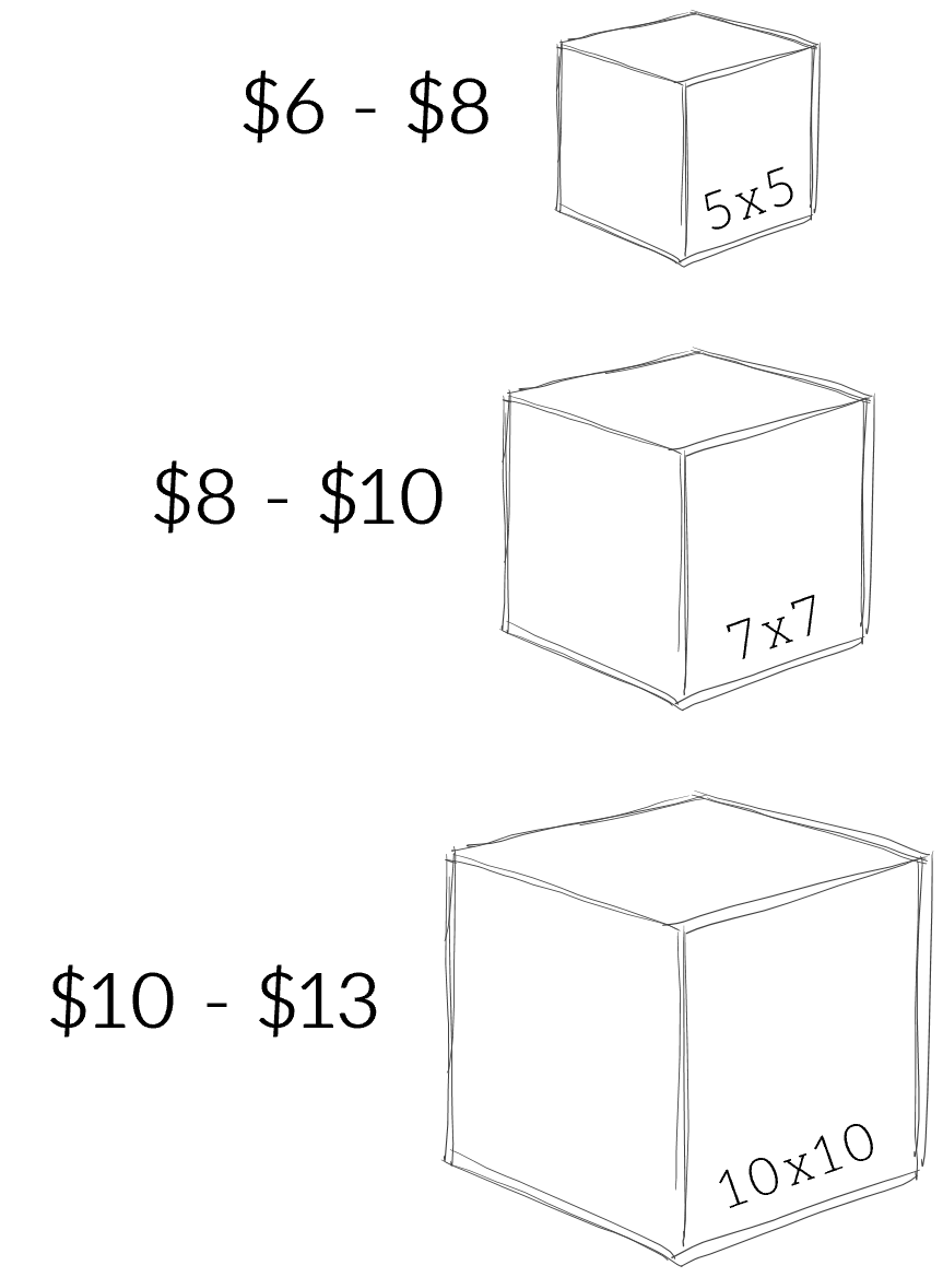 - Gifts larger than our biggest box are measured on the diagonal and are $0.99/inch