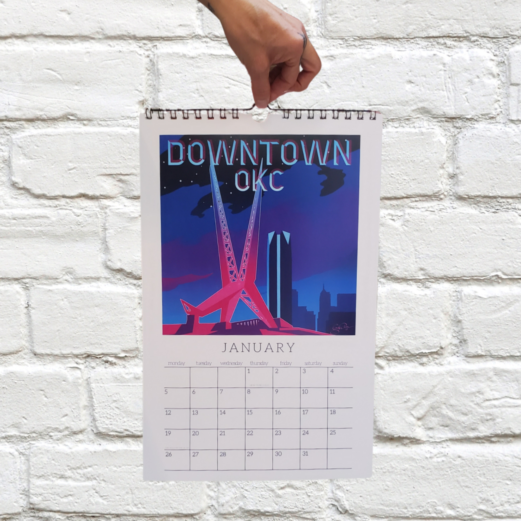 We’re so excited to bring back our OKC calendar made in collaboration with local artist, Greg White. Each month highlights one of Greg’s OKC-themed designs, including famous OKC districts and landmarks. These wall calendars feature a spiral coil across the top with a wire hanger and are approximately 11in x 17in.