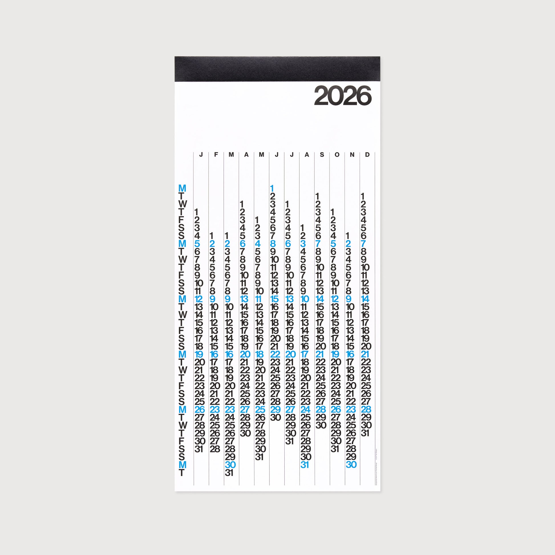 Created by two longtime collaborators of Massimo Vignelli - the designer of the Stendig - the V Calendar pays homage to the late maestro’s modernist aesthetic and design ethos. Deploying Vignelli’s signature tightly-kerned Helvetica, designers Yoshiki Waterhouse and Beatriz Cifuentes, lay out all 365 days on a single sheet, forming an undulating pattern across the year.
