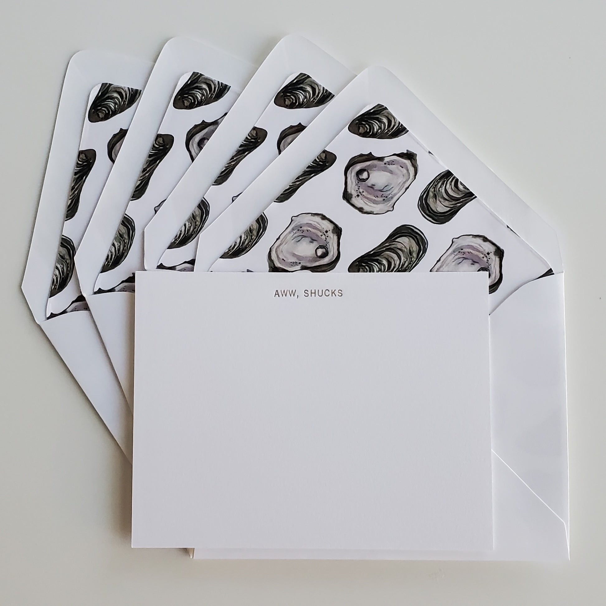 These adorable 4.25″ x 5.5″ flat notecards are hand-stamped in gold foil, with "AWW, SHUCKS". These make a great gift for the foodie or pun lover in your life. A great addition to your personal stationery!