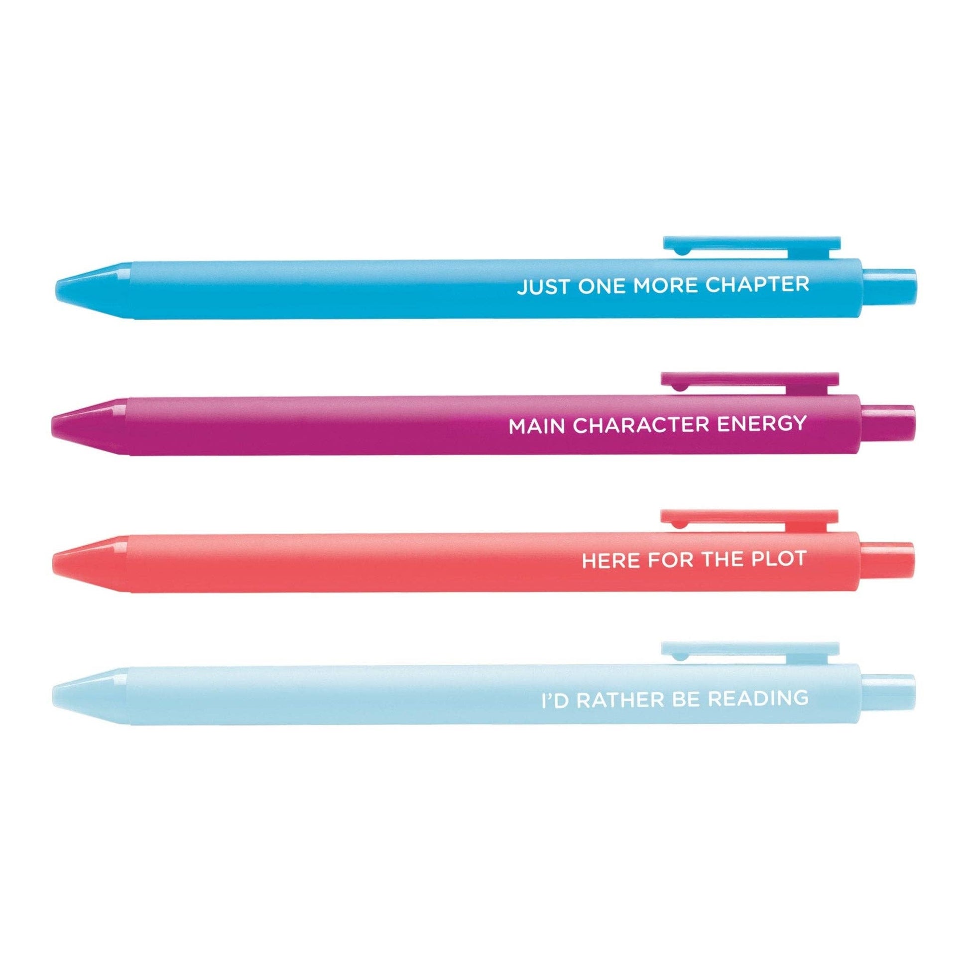Includes 4 pens with sayings: - Just One More Chapter - Main Character Energy - Here for the Plot - Iād Rather Be Reading ā Smooth black ink, click-action pens in vibrant colors ā Perfect for annotating, book journaling, note-taking, or cute desk flair ā A great gift for book lovers, book club members, and reading influencers Because reading is your personal