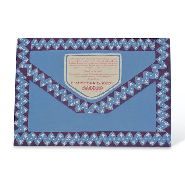 Thirteen large double-sided patterned card letters which spell out HAPPY BIRTHDAY. The letters are in assorted colours and designs, all with a strong folk art aesthetic, contained in a self-closing card wallet for long term storage. String together on yarn or ribbon of your choice. The letters are a generous 185 mm tall and the garland makes a dramatic decorative feature. Makes approximately 2-3 metres of garland, depending on how closely the letters are strung together.