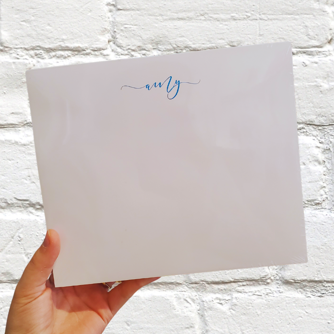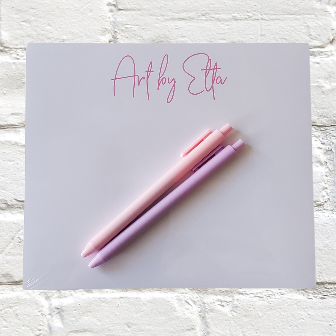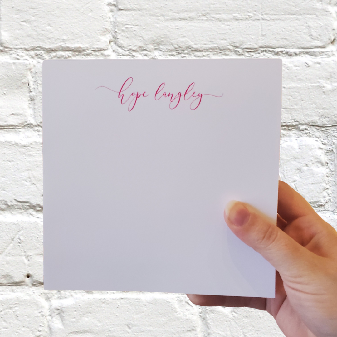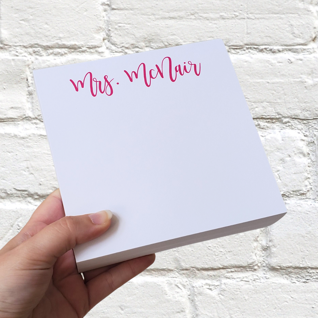 This personalized notepad includes 250 sheets gummed at the top with a name of your choice centered at the top. There are two size options available, the desk slab and super slab. Desk slabs are 6 x 6in and super slabs are 7.25 x 8.5in (see picture for size comparison). These make the perfect personalized gift for a wedding, promotion, or any celebratory occasion.