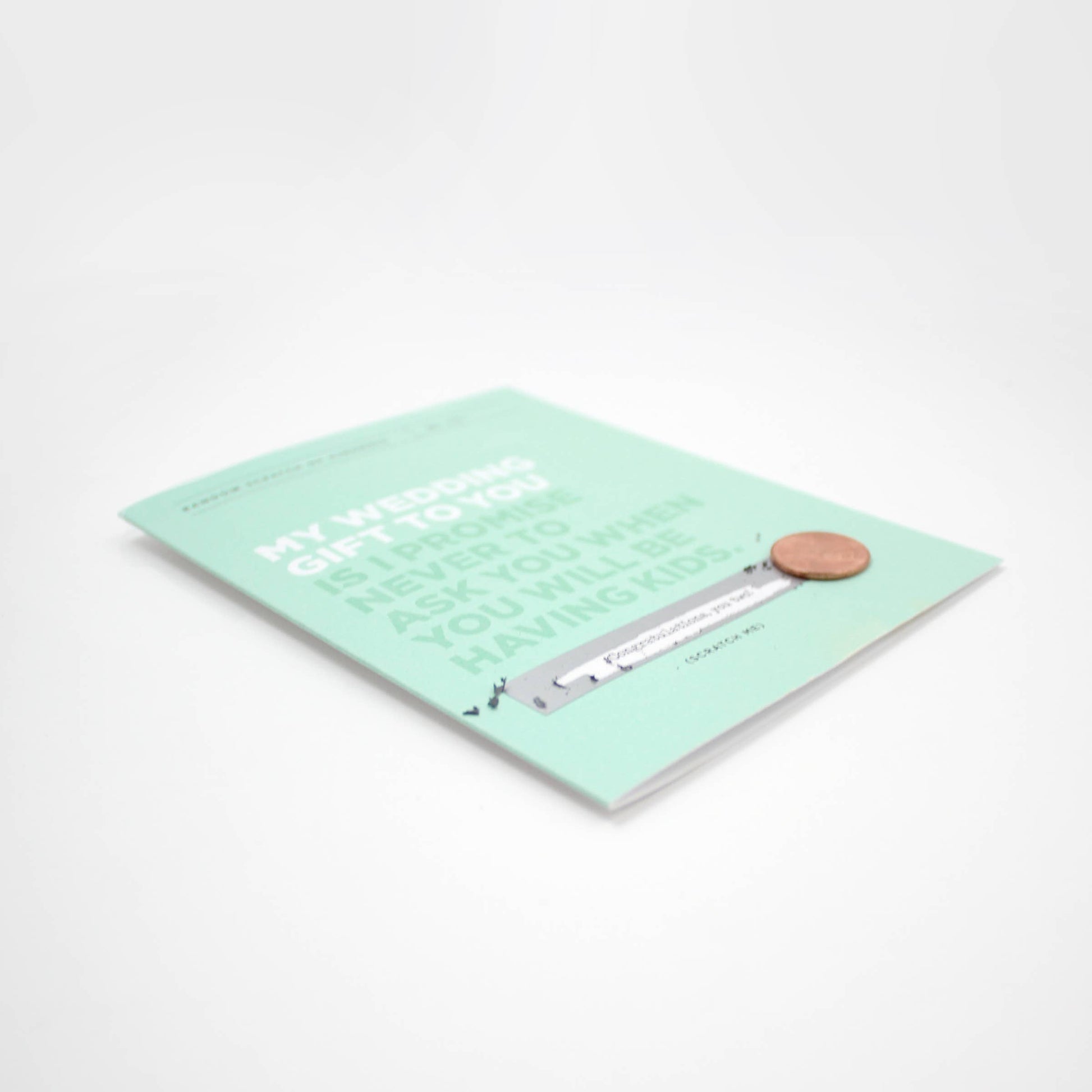 My Wedding gift to you is I promise never to ask when you will be having kids. Hidden Message: "Congratulations, you two!"