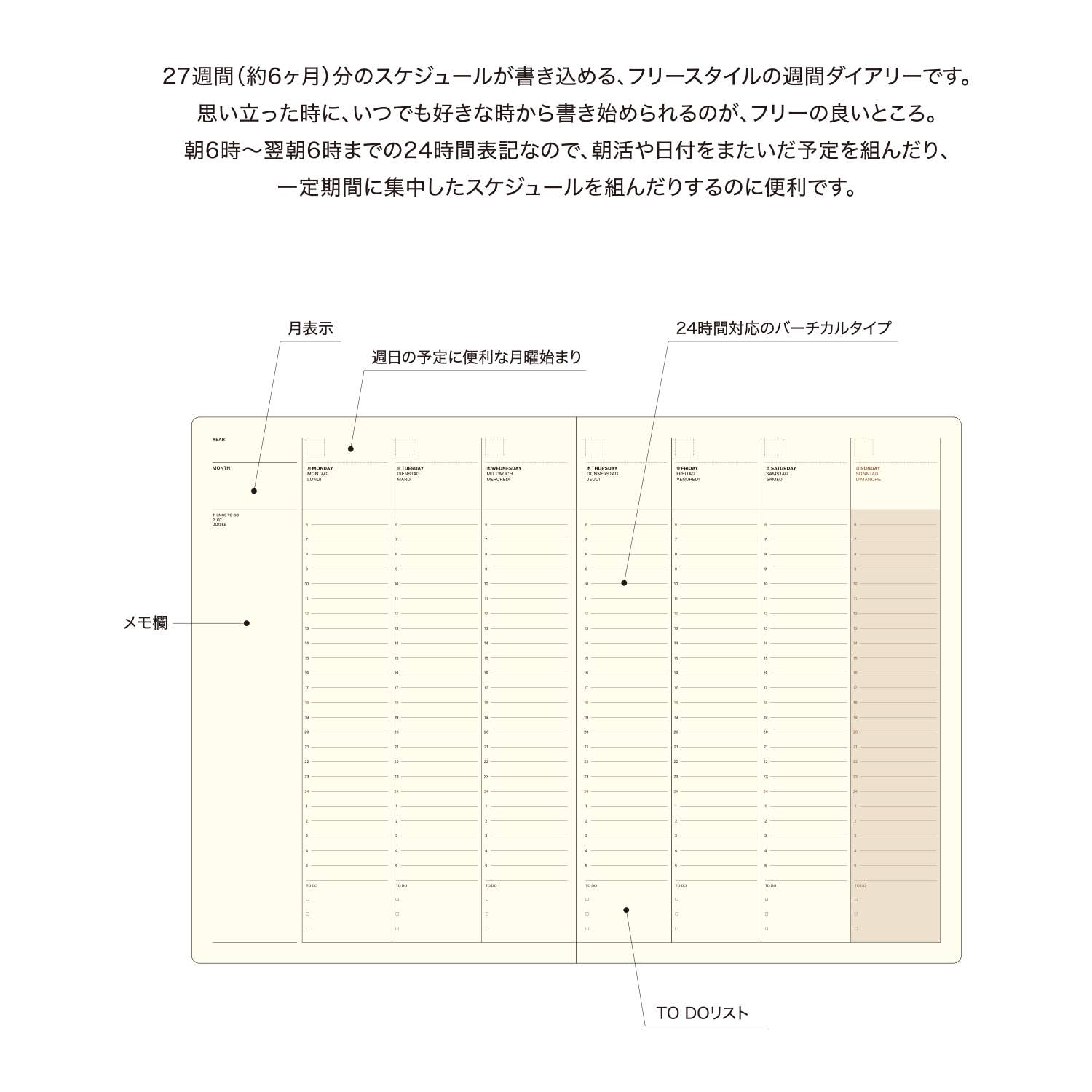 A freestyle weekly diary that allows you to plan for 27 weeks (approximately 6 months). Its undated format lets you start writing whenever you feel like it, at any time you choose. With a 24-hour layout spanning from 6 AM to 6 AM the next morning, it's perfect for early morning activities, scheduling across midnight, or focusing on concentrated schedules for specific periods.