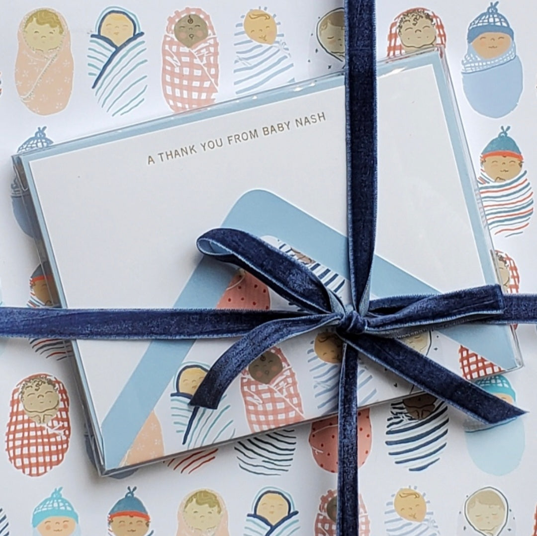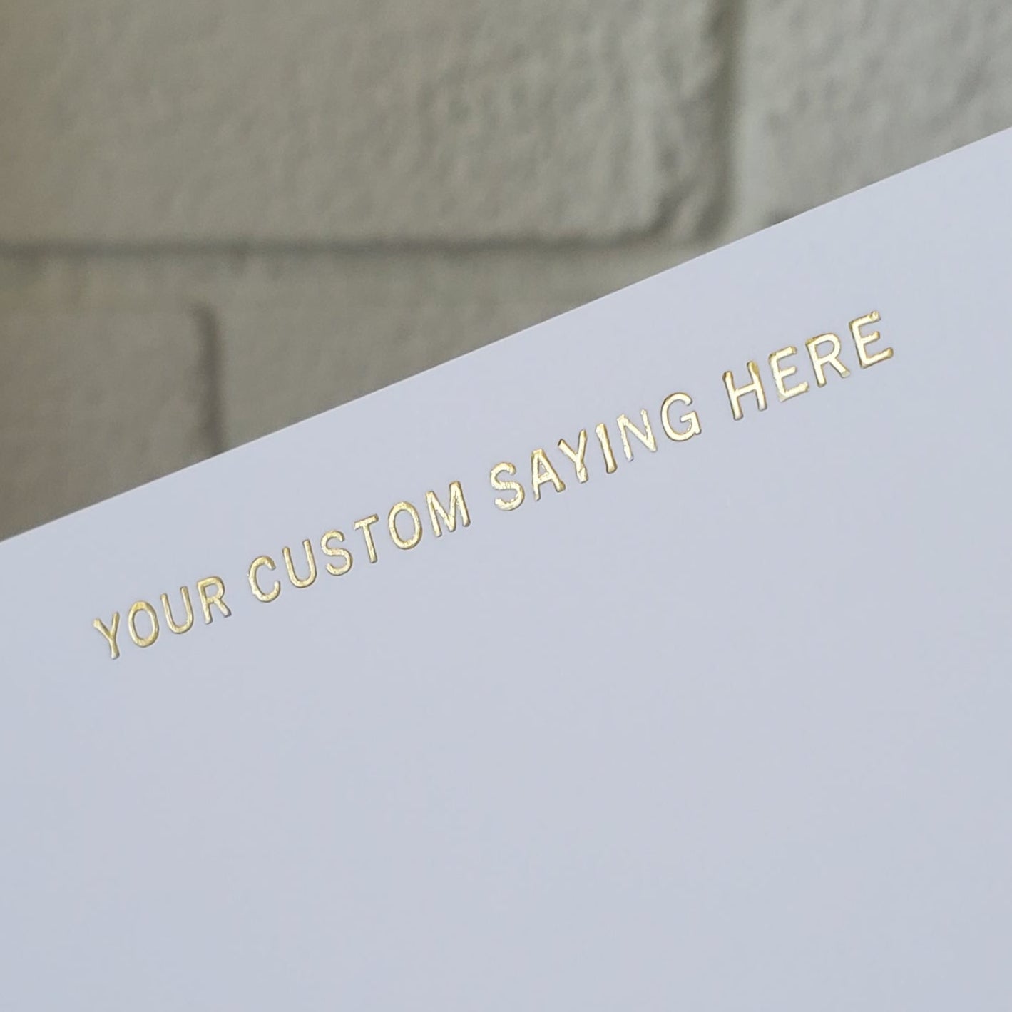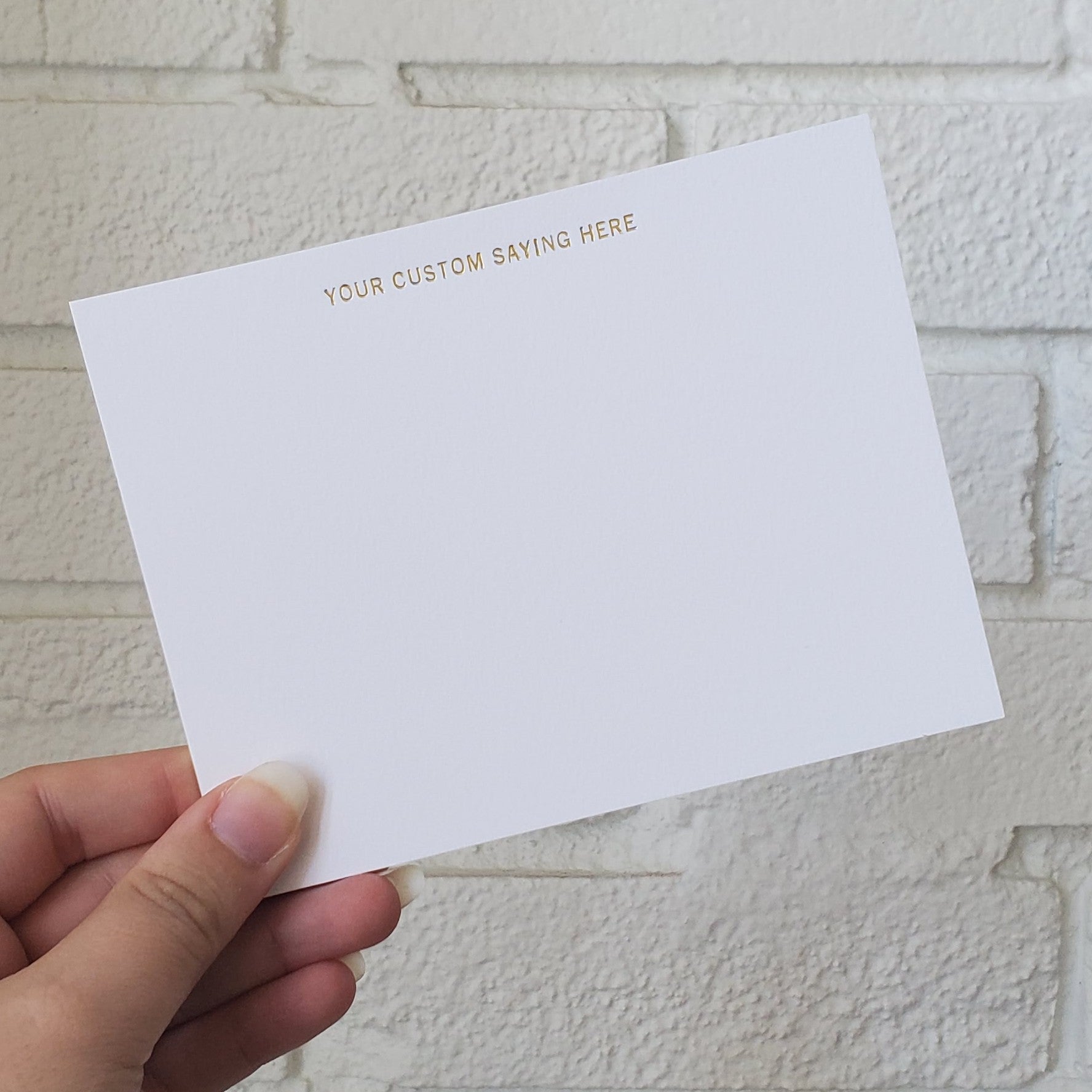 These adorable 4.25″ x 5.5″ flat, horizontal notecards are hand-stamped in gold foil, with a saying, name, or initials of your choosing. Sayings are limited to 24 characters. Punctuation and numbers are available in this font. Each set comes in a clear box with an assortment of lined A2 envelopes.