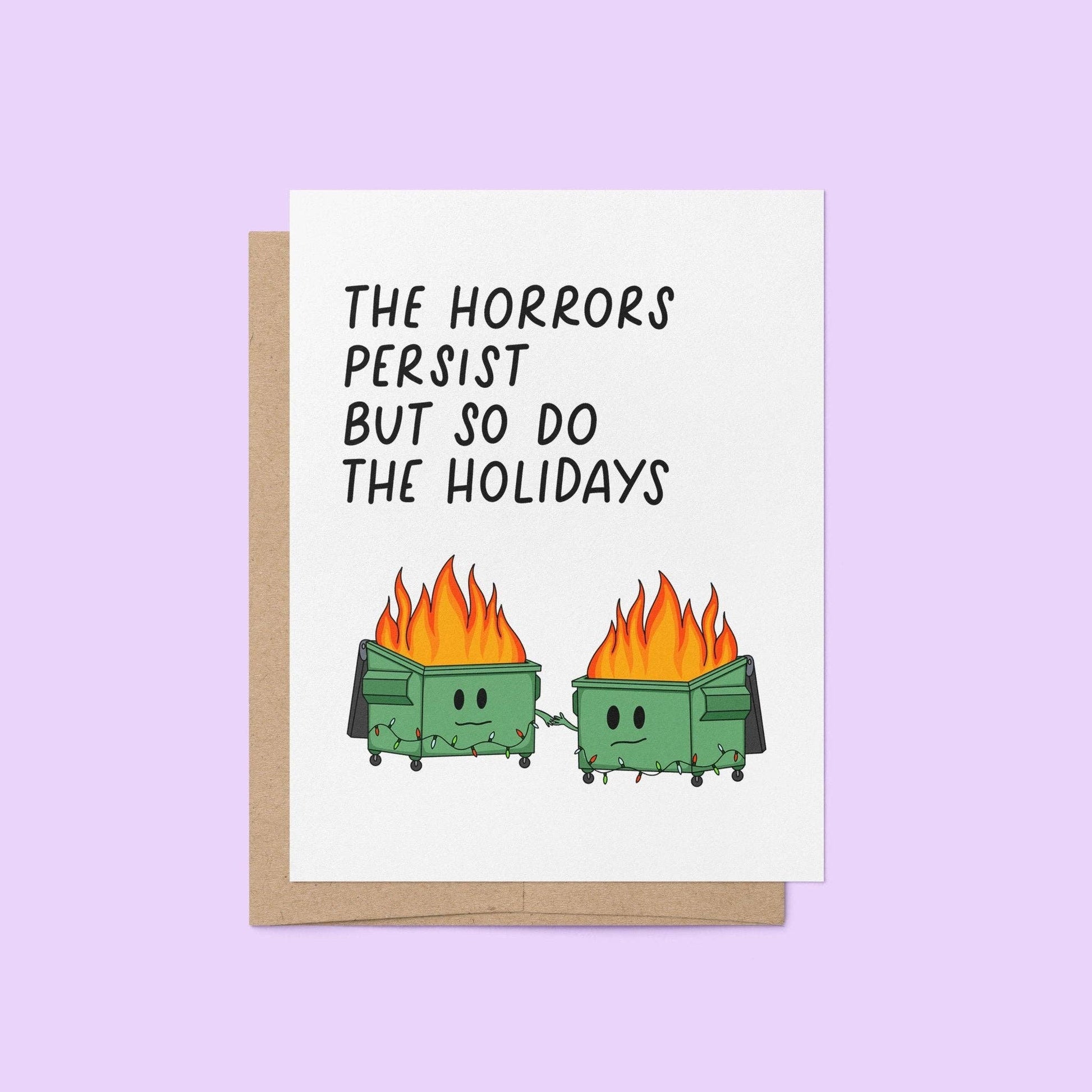 Because even during a dumpster fire year, the holidays still happen. Our Horrors Persist But So Do the Holidays card is the perfect blend of existential dread and festive spirit. Featuring two smiling flaming dumpsters holding hands (yes, seriously), this card says what we’re all thinking—with a wink. Ideal for friends, coworkers, and family members who appreciate dark humor and painfully accurate holiday vibes.