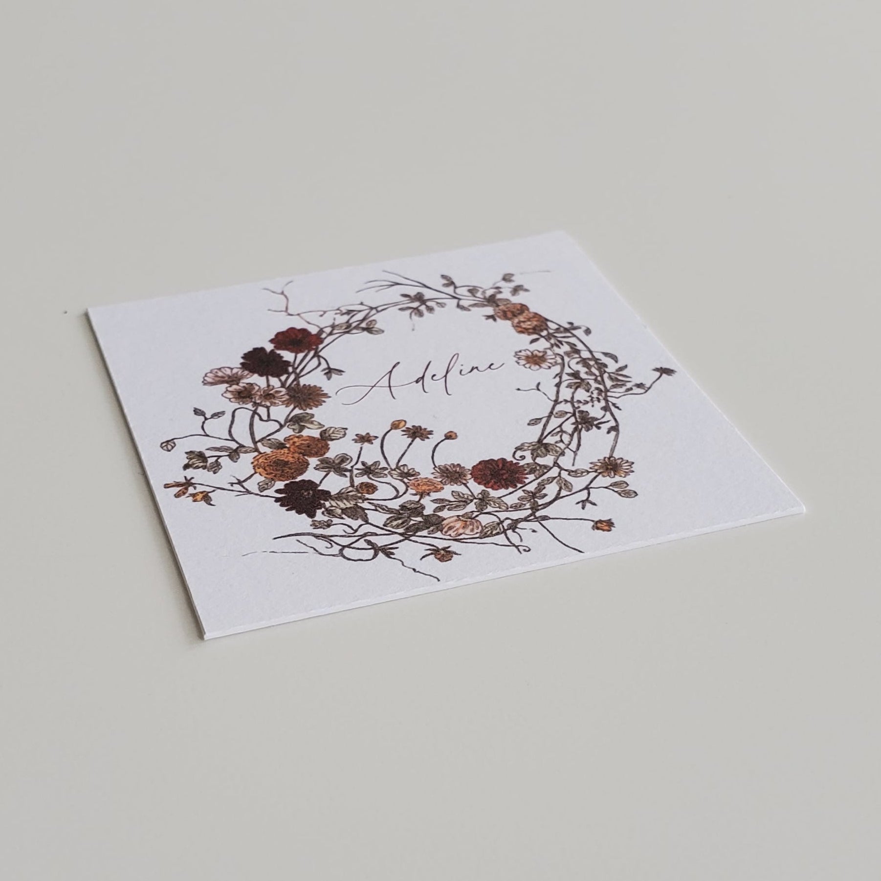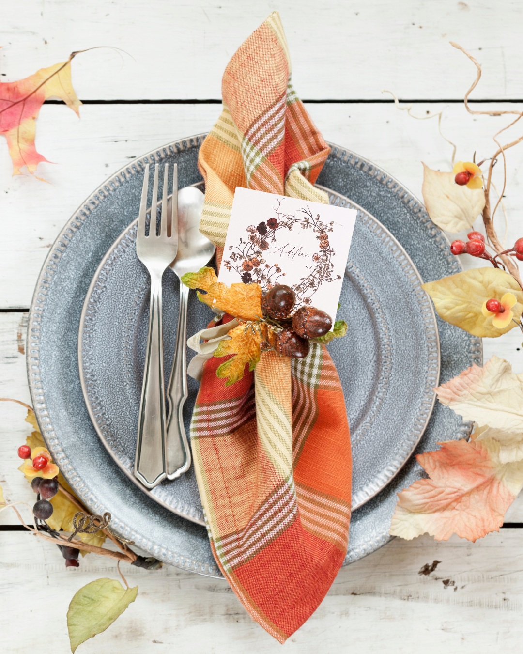 Elevate your Thanksgiving tablescape with personalized place cards at each setting. These personalized place cards can have each guest's full name (first and last) or just their first. Place cards are approximately 2.5in x 2.5in.