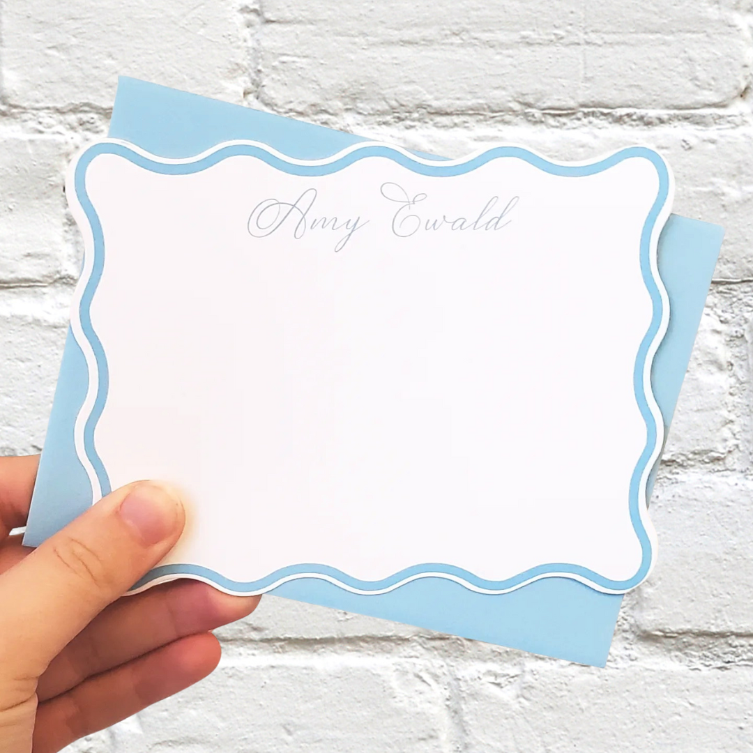 These 4.25″ x 5.5″ flat notecards are surrounded by an adorable wavy die cut border. They are flat printed in multiple fonts and colors. Each set comes with coordinating envelopes.