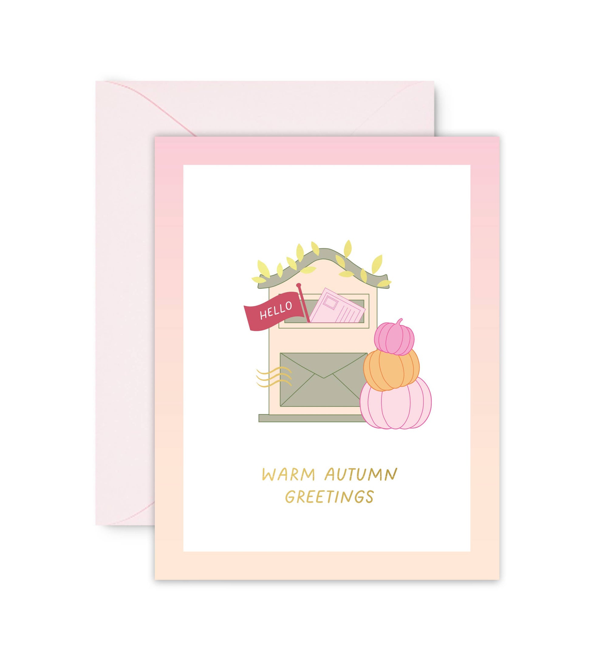 Mailbox illustration for fall greetings. Blank inside, the card is full-color printed on premium paper and paired with a light pink envelope. The card is accented with gold foil details for a little extra touch of magic!