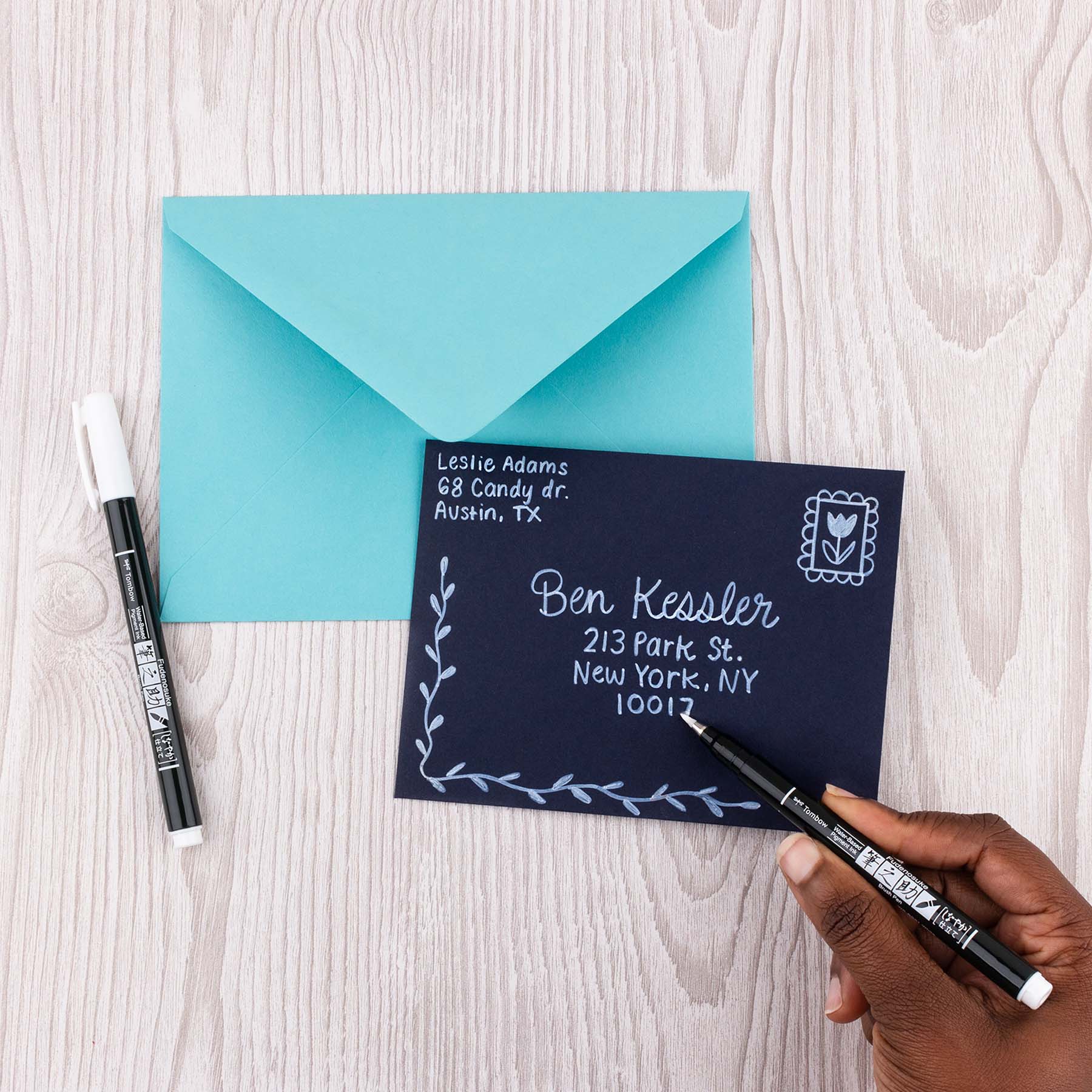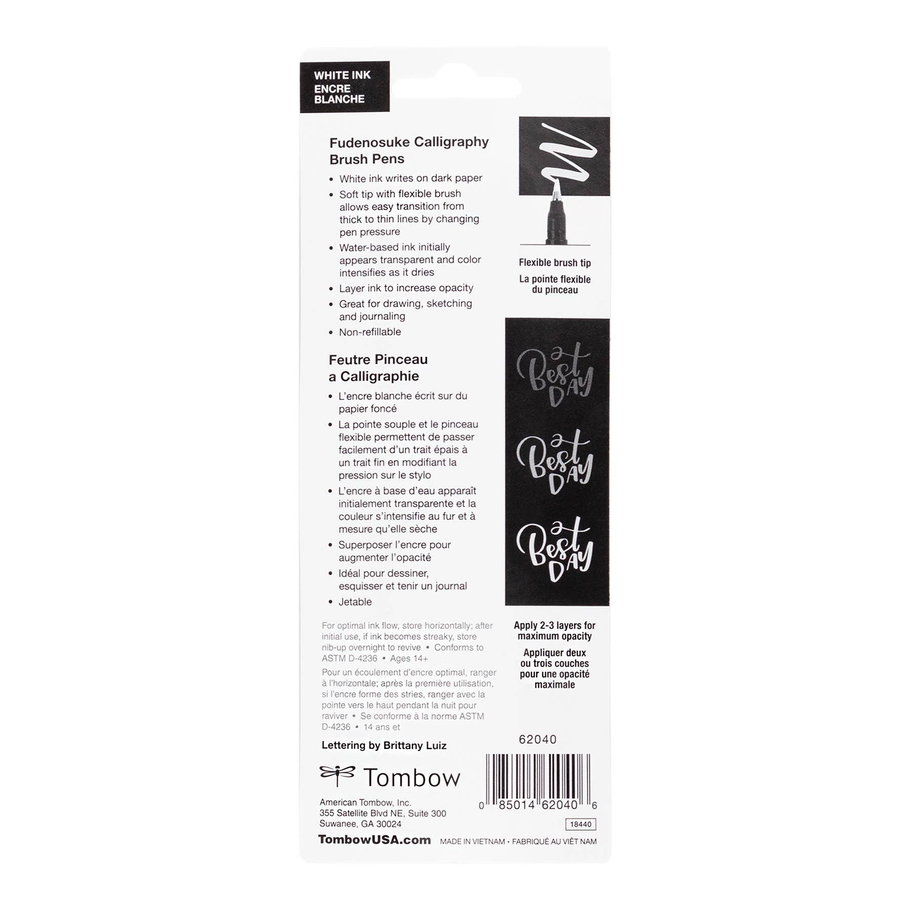 Great for beginner brush calligraphy, hand lettering, and illustration. The first Fudenosuke Brush Pen that writes on dark paper! Soft, flexible brush tip creates thick and thin lines by changing pen pressure. Water-based pigment ink initially appears transparent and color intensifies as it dries for a chalky look. For optimal opacity on dark paper, apply 2-3 layers to intensify saturation. The water-resistant ink won’t bleed through most papers.