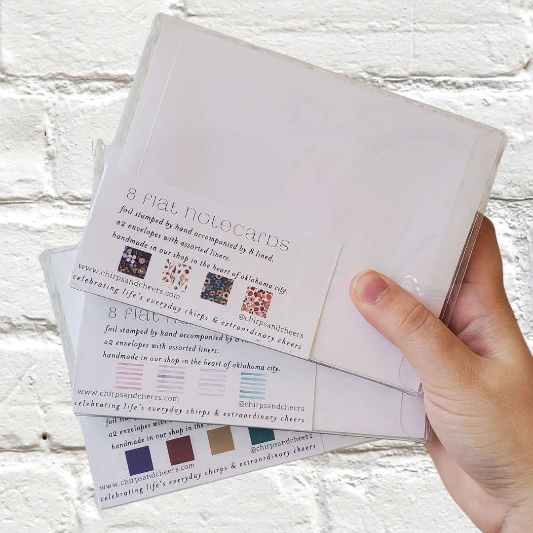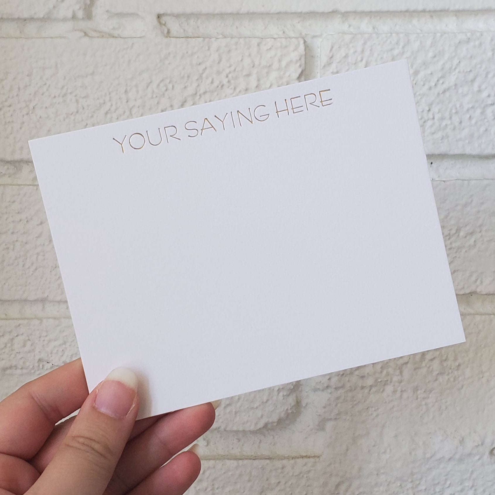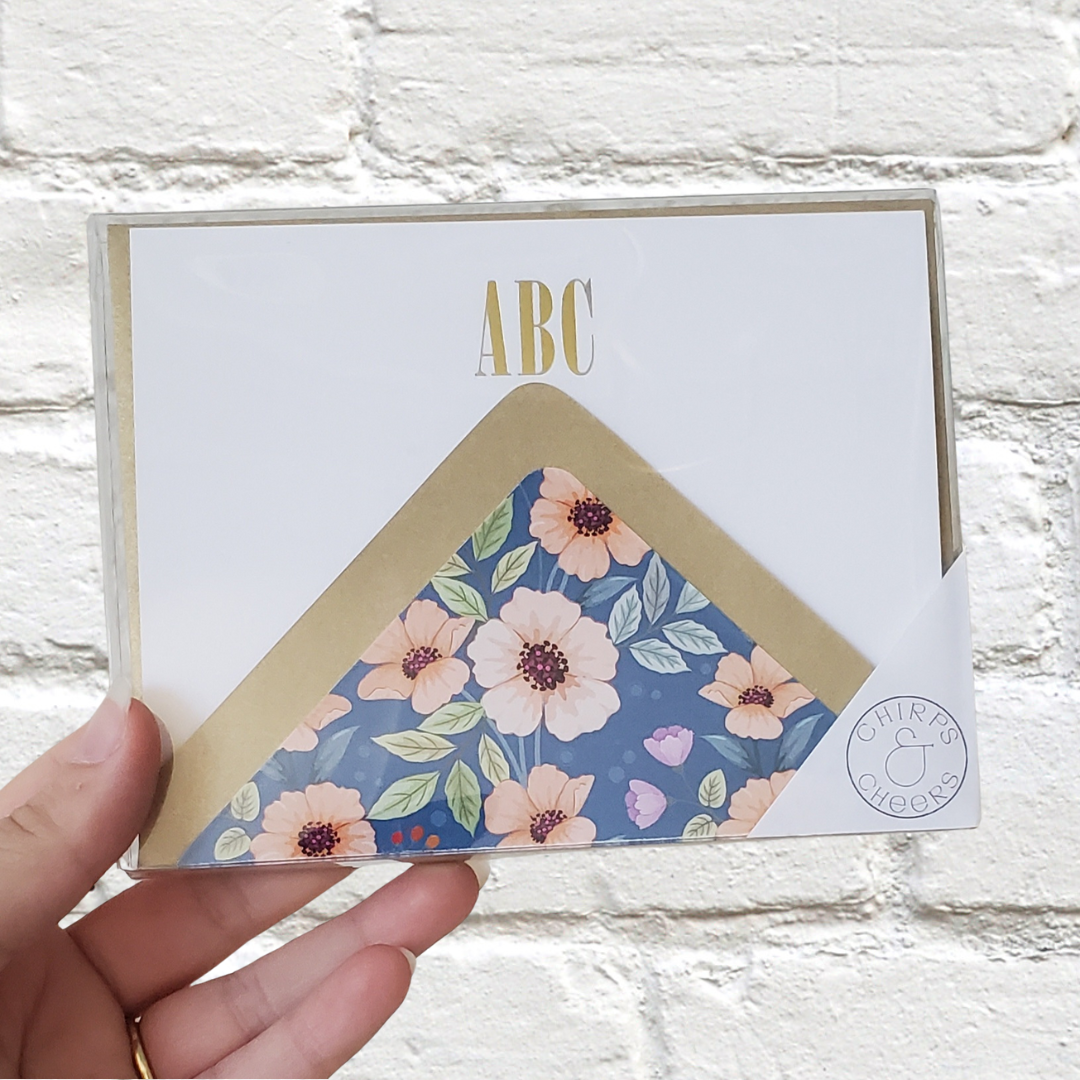 These adorable 4.25″ x 5.5″ flat, horizontal notecards are hand-stamped in gold foil, with a saying, name, or initials of your choosing. Sayings are limited to 15 characters. Punctuation and numbers are available in this font. Each set comes in a clear box with an assortment of lined A2 envelopes.
