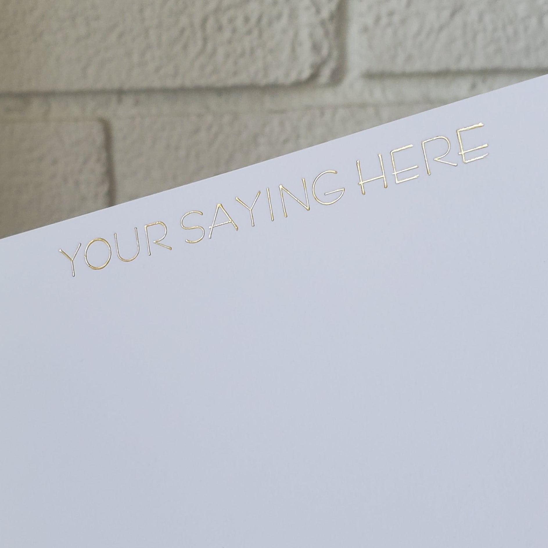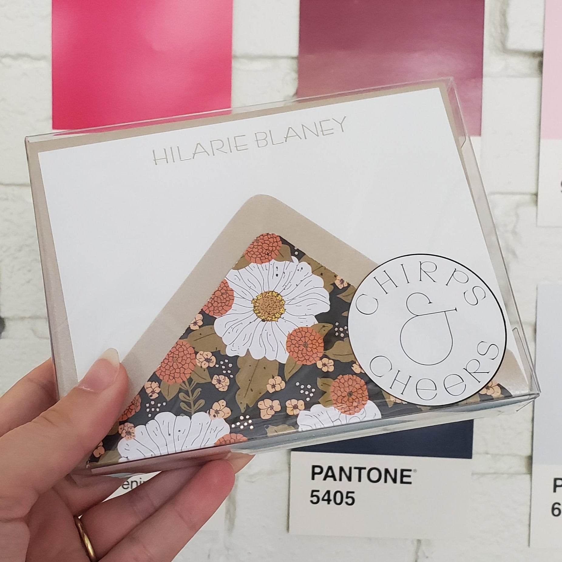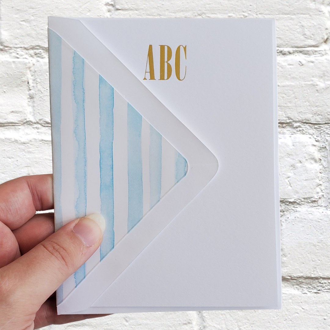 These adorable 4.25″ x 5.5″ flat, horizontal notecards are hand-stamped in gold foil, with a saying, name, or initials of your choosing. Sayings are limited to 15 characters. Punctuation and numbers are available in this font. Each set comes in a clear box with an assortment of lined A2 envelopes.