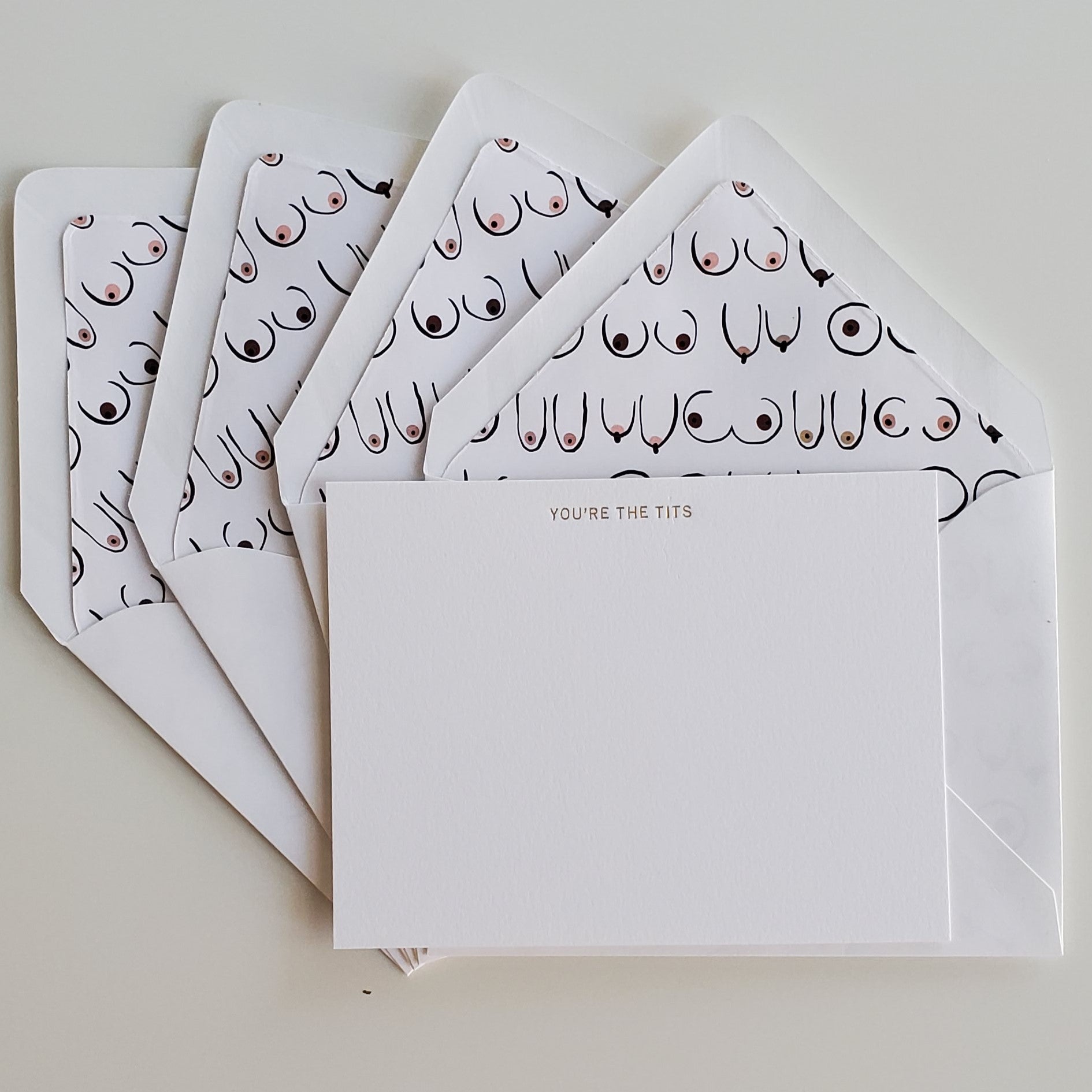 These adorable 4.25″ x 5.5″ flat notecards are hand-stamped in gold foil, with "YOU'RE THE TITS". These make a great gift for the pun lover in your life. A great addition to your personal stationery!